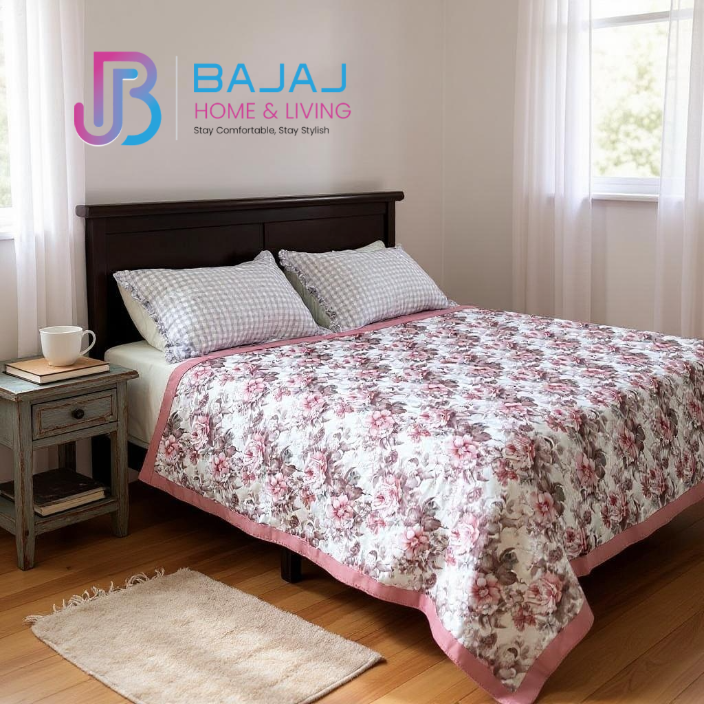 Romantic charm, zero compromise. Blush Elegance is your premium cotton comforter, crafted from 100% pure cotton with advanced 3D digital printing for soft, long-lasting colours. Designed in a standard size for two, this comforter celebrates timeless floral elegance with delicate rose-pink blossoms and muted grey foliage on a crisp ivory base. Aligned with 2025’s trend of romantic florals and soothing pastels, it brings everyday comfort with a touch of sophisticated charm.