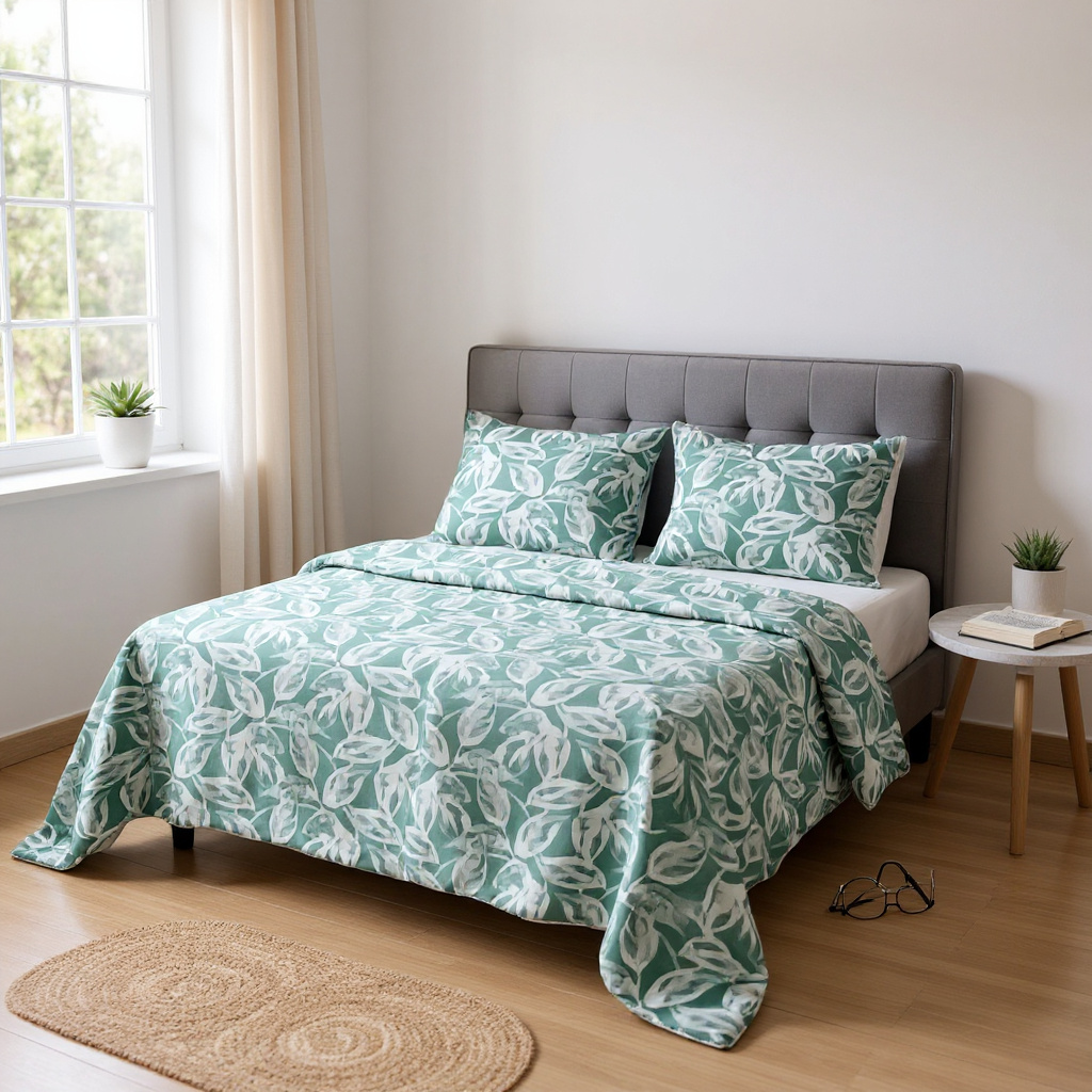 Nature-inspired calm, effortless comfort. Leafora Serenity is your all-in-one 3-piece quilt cover set crafted from 100% cotton with a 250 thread count — the perfect balance of softness, breathability, and lasting durability. Its delicate botanical leaf design in Sage Whisper brings fresh, serene elegance to your bedroom.