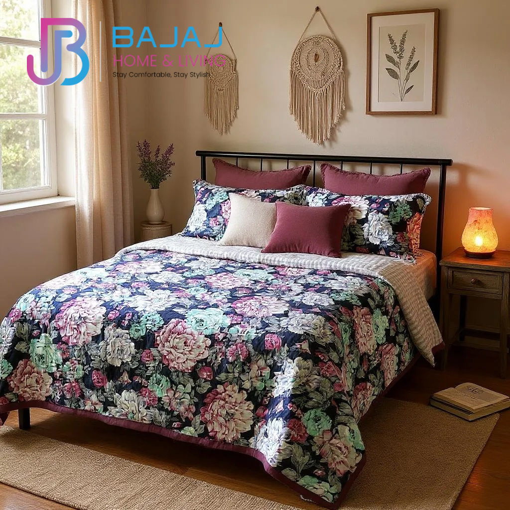 Bold elegance, zero compromise. Midnight Garden is your premium comforter crafted from 100% pure cotton with advanced digital printing for vibrant, true-to-life colours that last. Designed in a standard size for two people, this comforter combines breathable natural cotton comfort with the dramatic beauty of pastel florals in blush, mint, and lavender set against a deep noir base. Inspired by modern romance and high-contrast elegance, it transforms your bedroom into a bold statement of style and sophistication. Perfect for 2025’s décor trends celebrating floral revival and dramatic palettes.
