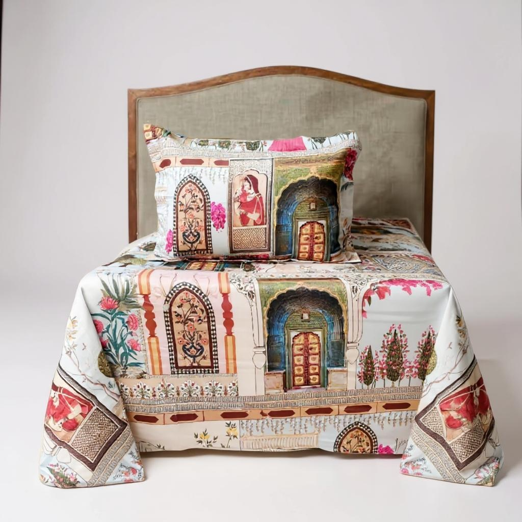Royal elegance, zero compromise. Palace Archways is your complete 5-piece bedsheet set crafted from 100% pure cotton with advanced 3D digital printing for vibrant, true-to-life colours that last. Designed exclusively in Queen Size, this set combines breathable natural cotton comfort with the grandeur of palace-inspired archways, domes, and floral accents in earthy ivory, sandstone, terracotta, and teal tones. Perfect for 2025’s trend of heritage revival and artisanal prints, this set transforms your bedroom into a timeless showcase of culture and sophistication.
