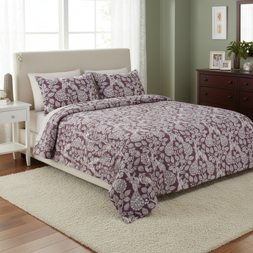 Soft, elegant, and effortlessly refined — Mulberry Mist blends intricate botanical and bird-inspired motifs with a warm mulberry-plum base, creating a calm yet luxurious bedroom aesthetic. Crafted from 100% breathable cotton with a smooth 250 thread count, this 5-piece set offers natural airflow, long-lasting comfort, and a stylish statement for modern homes.