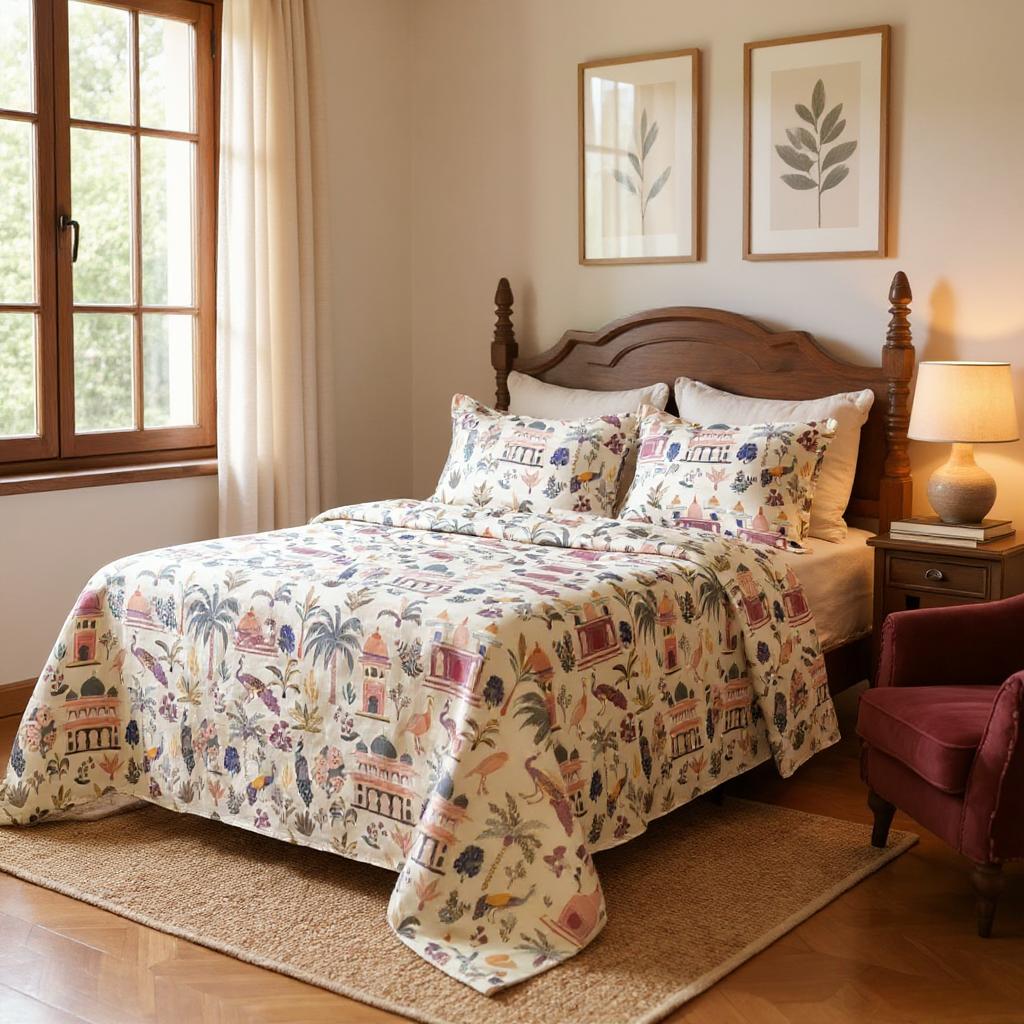 Majestic charm, zero compromise. Regal Courtyard is your complete 5-piece bedsheet set crafted from 100% pure cotton with advanced 3D digital printing for vibrant, true-to-life colours that last. Designed exclusively in Queen Size, this set combines breathable natural cotton comfort with the grandeur of domes, arches, peacocks, and tropical florals on a soft beige base. Inspired by royal palaces and lush courtyards, it brings cultural richness and timeless artistry into your bedroom. Perfect for 2025’s décor trends celebrating heritage revival and statement prints.