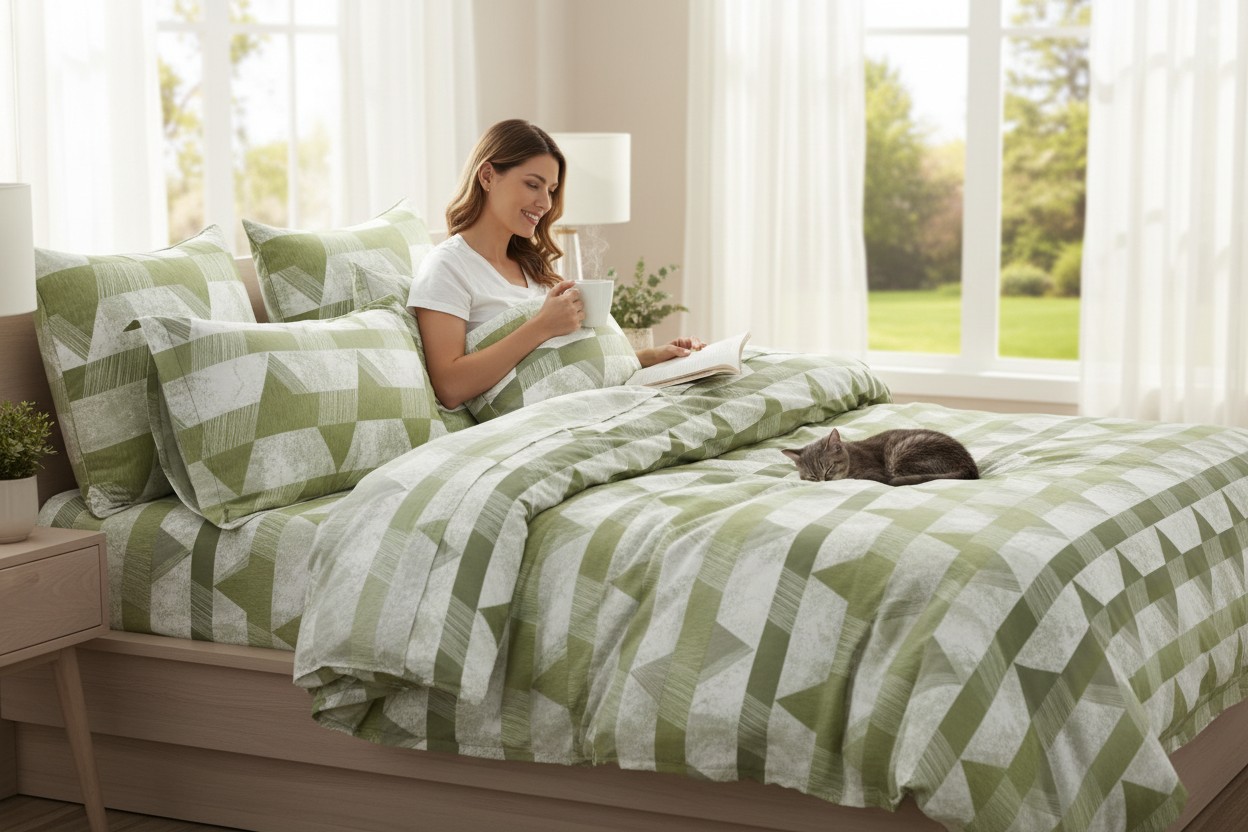 Modern structure, zero hassle. Sage Geo Ascent is your all-in-one 7-piece bedsheet set crafted from premium cotton-feel microfiber with a luxurious 300 thread count—smooth like natural cotton yet built for easy care and lasting durability. Its bold geometric triangles in calming sage green and crisp white create a rhythmic, structured pattern that feels both modern and refreshing. Perfect for 2025’s geometric and earthy décor trend, this set adds balance, energy, and contemporary flair to your bedroom.
