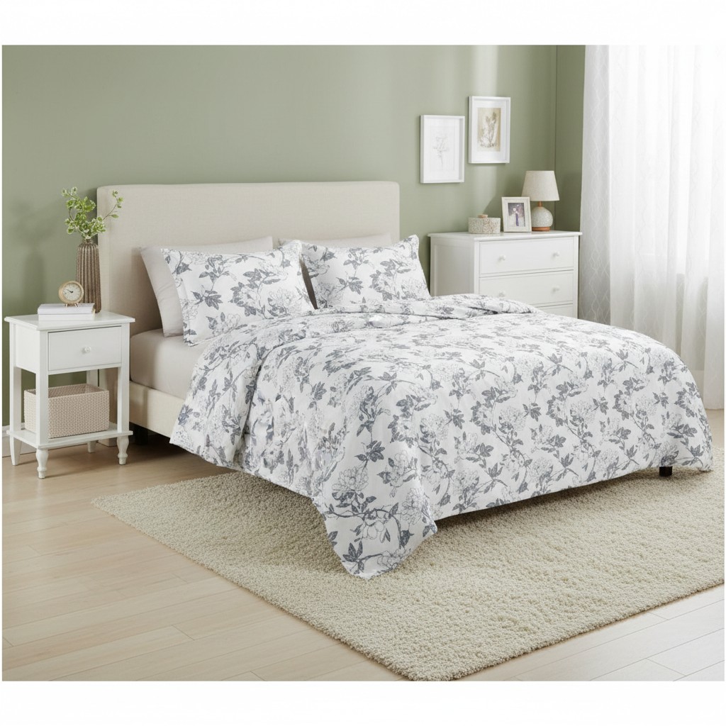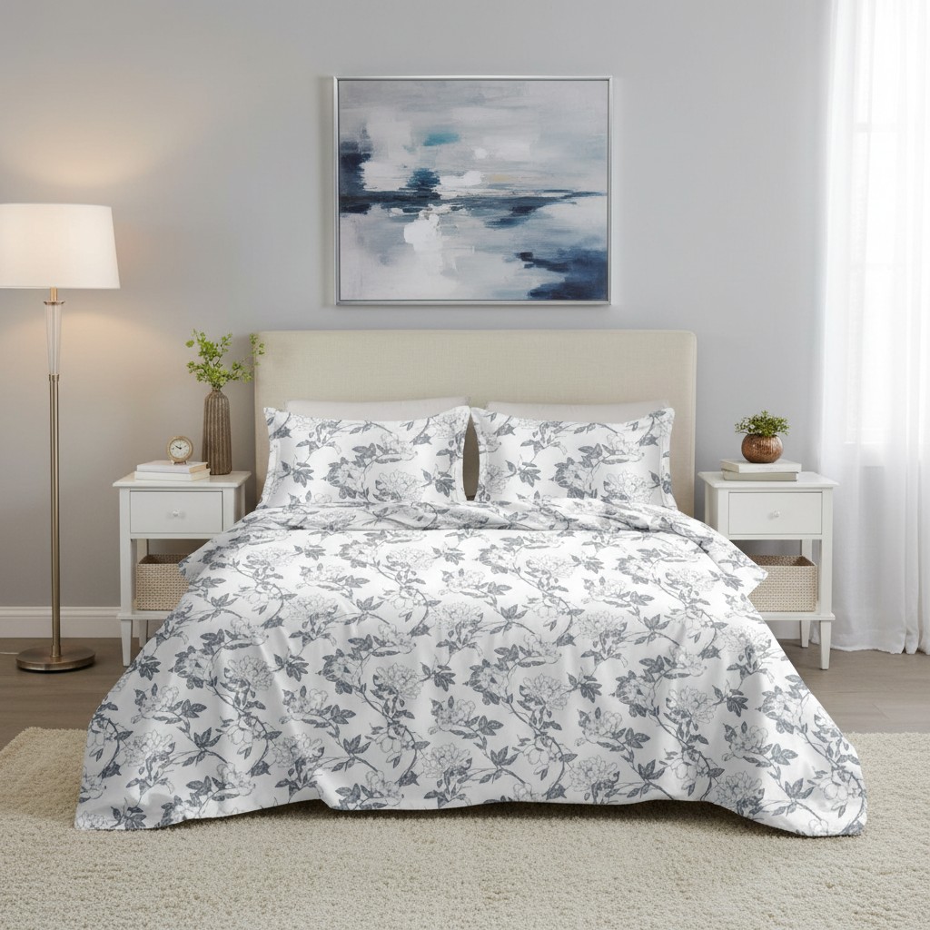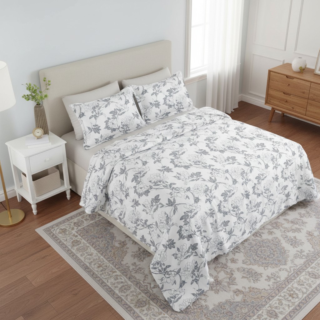 Soft vintage charm, zero hassle. Vintage Ink Bloom is your all-in-one 7-piece bedsheet set crafted from 100% cotton with a 250 thread count—the perfect balance of breathability, everyday softness, and lasting durability. Its crisp white base paired with hand-drawn grey willow-floral ink motifs brings a calm, elegant sophistication to your bedroom while keeping the look fresh, airy, and timeless.