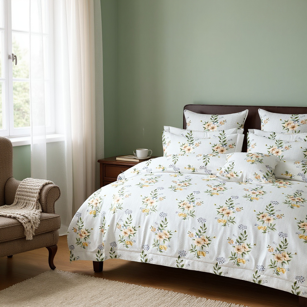 Fresh blooms, effortless charm. Whispering Pastel Garden is now available as a 3-piece quilt cover set—crafted for those who want soft floral elegance without the full 7-piece bundle. Made with premium cotton-feel microfiber and a luxurious 300 thread count, it offers silky comfort, year-round breathability, and lasting durability. Featuring gentle yellow blossoms and lilac sprigs on a mint meadow base, this design blends timeless romance with 2025’s trending pastel palettes—perfect for adding serenity to your bedroom.